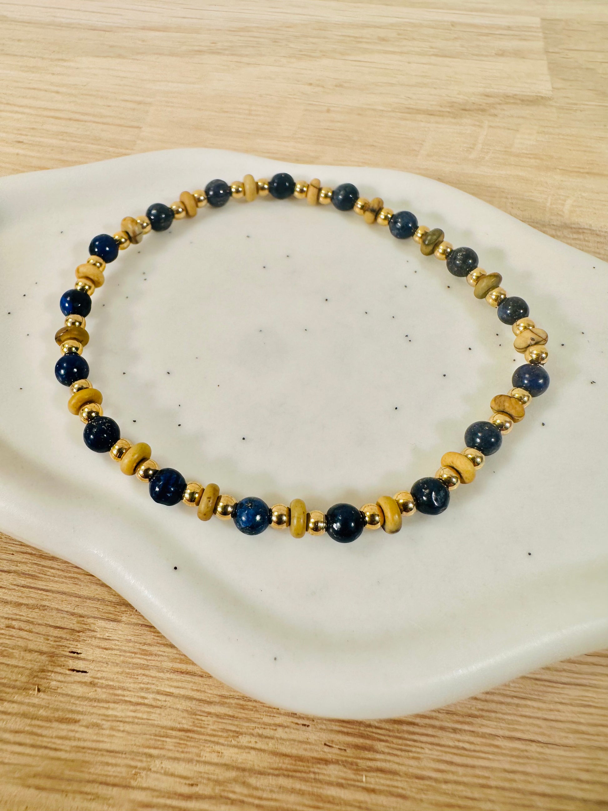 - de pierres rondes en Lapis-Lazuli et des perles en bois beige,